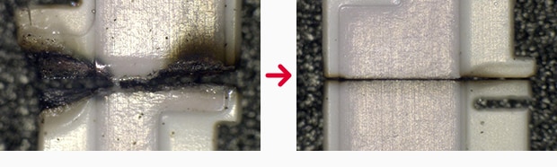 UV lasers break down bonds directly, so minimal heat stress is used when marking. Because of this, no residue of burrs or yellow tinting is left over on the marked materials.