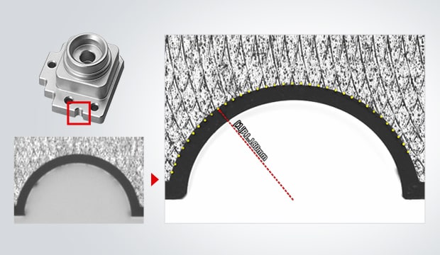 The low-measuring-pressure touch probe moves freely vertically, horizontally, and at an angle, allowing the desired points to be measured with a soft touch. Even parts with 3D shapes can be measured accurately.